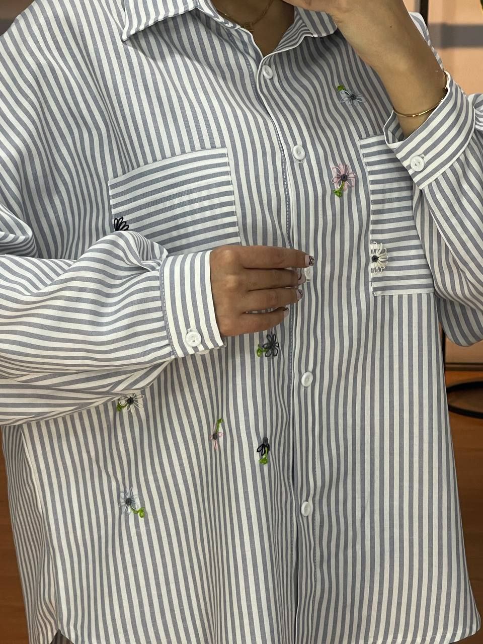 گلدوزی دستی ظریف: در قسمت جلوی شومیز، طرحهای گل مارگریت با ظرافت تمام توسط دست گلدوزی شدهاند که ارزش و زیبایی لباس را دوچندان کرده است.